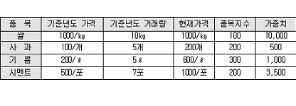 -- 쌀은 가격이 오르지 않았으므로 품목지수는 100, 사과는 가격이 두배가 되어 품목지수가 200등