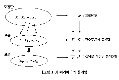 -- [그림 3-3]은 모집단과 파라메터, 이에 대응되는 표본과 통계량의 관계를 나타내고 있다.
