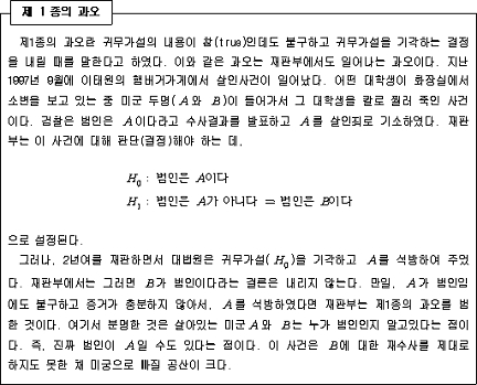 먼저, 귀무(영)가설의 내용이 옳은 데도 불구하고 귀무(영)가설을 기각하는 과오가 있다.