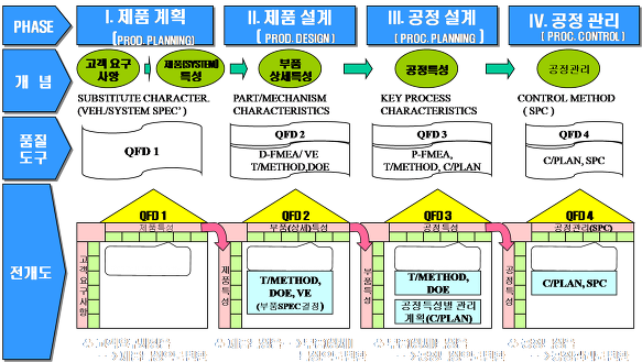 QFD는 말 그대로 품질의 기능을 고객의 요구로 부터 제품에서 부터 공정관리 특성으로 까지 연결해가는